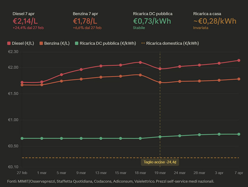 Una rincorsa dei prezzi calmierata (in parte) lo scorso 19 marzo da un taglio delle accise di 24,4 centesimi, voluto dal governo per arginare l'impatto diretto sui consumatori, con non ha però invertito in modo strutturale la tendenza di fondo. Eppure, se spostiamo lo sguardo dalle pompe di carburante tradizionale alle infrastrutture per la ricarica dei veicoli a batteria, la musica cambia.