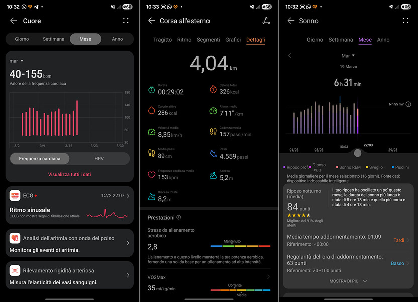 Il sistema TruSense copre frequenza cardiaca continua, HRV, SpO₂, ECG e rilevamento aritmie. Il monitoraggio del sonno è dettagliato e il Recovery Degree (un indicatore da 0 a 100 che suggerisce quando spingere e quando riposare) si è rivelato uno strumento sorprendentemente utile nella gestione settimanale degli allenamenti.