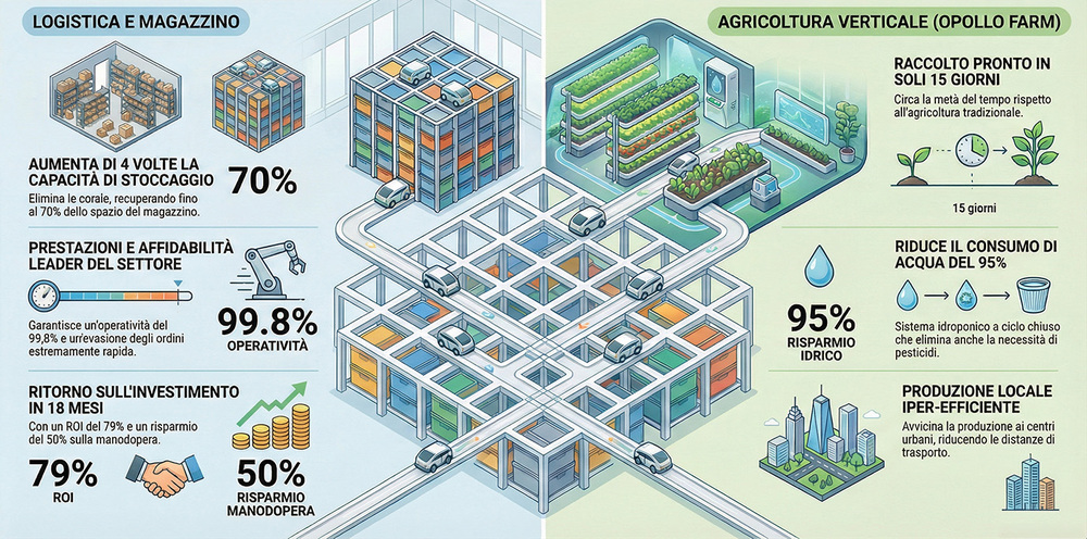 Ed è qui che il magazzino smette di parlare solo di e-commerce. Opollo Farm, fuori Phoenix, usa la tecnologia AutoStore in una fattoria verticale automatizzata realizzata con OnePointOne. Al posto dei prodotti, nei contenitori crescono erbe aromatiche e verdure: non sono le persone a spostarsi tra scaffali, sono le piante a muoversi dentro la griglia.