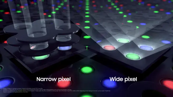 Questo è un display molto particolare che ha milioni di pixel, ma non sono tutti uguali: una parte è composta da Wide Pixel, con una microlente frontale che permette la dispersione della luce in tutte le direzioni. Il resto sono chiamati Narrow Pixel, con una sorta di barriera o imbuto che costringe la luce in un cono frontale stretto. Quando si attiva il Privacy Display, lo smartphone non fa altro che limitare l'illuminazione dei Wide Pixel, aumentando contestualmente quella dei Narrow Pixel, così che chi si trova su un angolo laterale vedrà poco o nulla